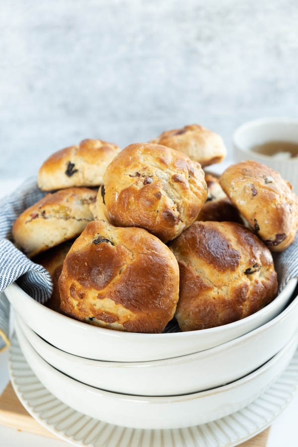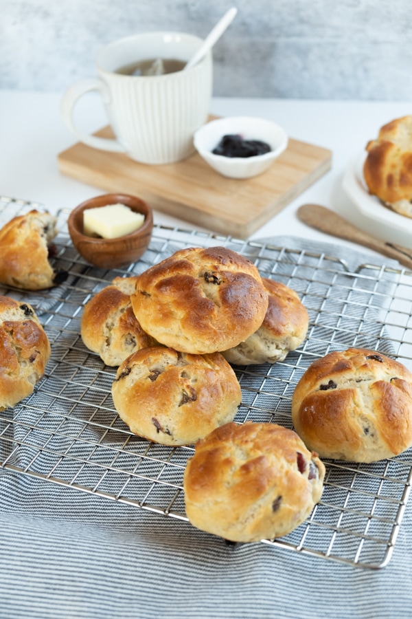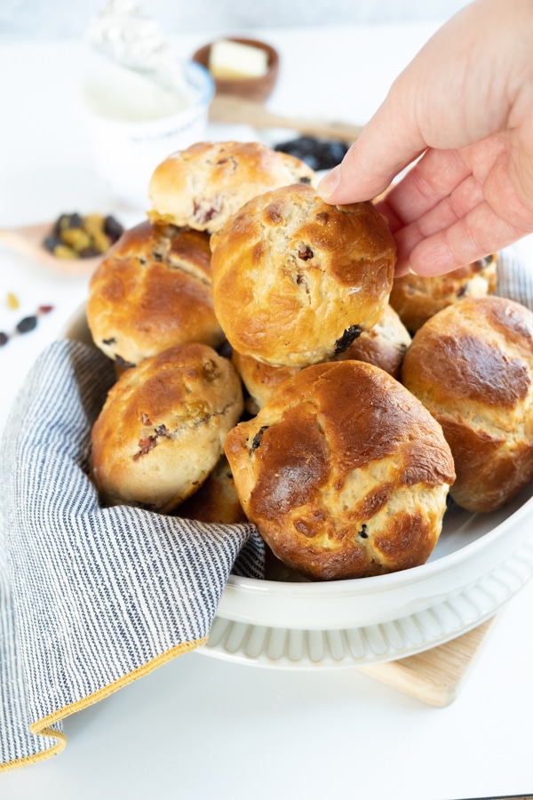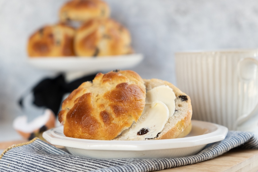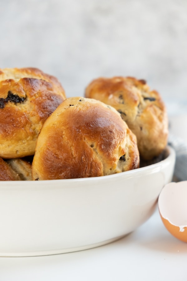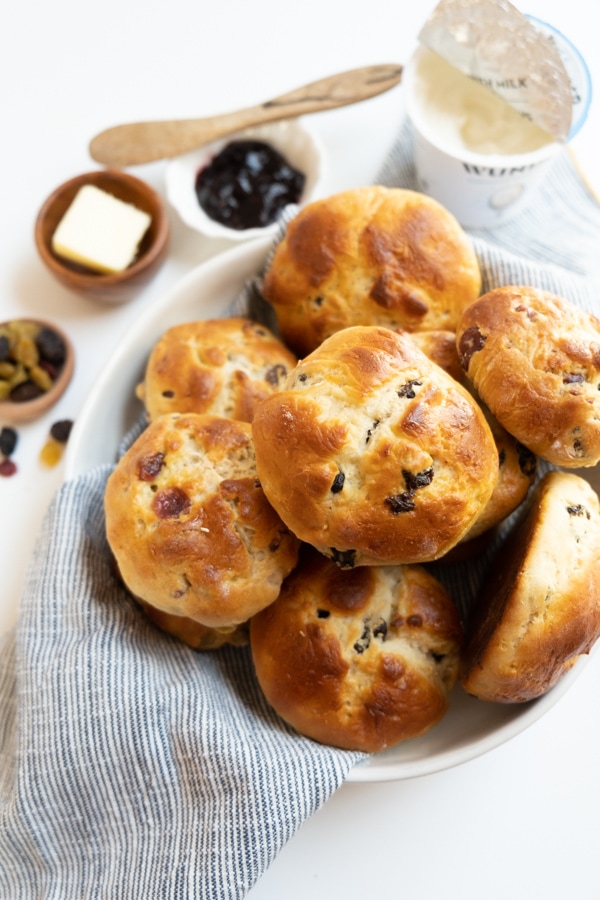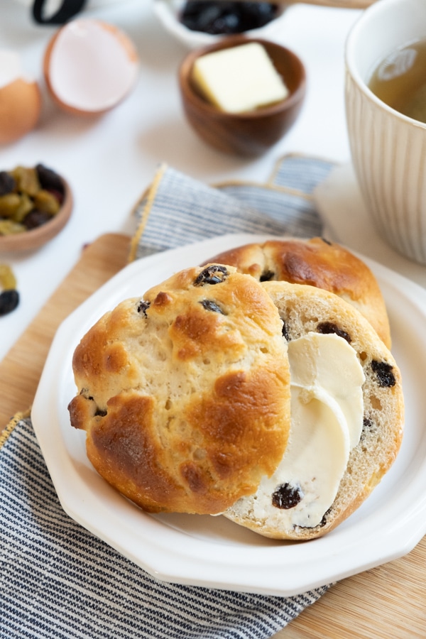 These slightly sweet, tender, raisin-filled buns are perfect for breakfast or brunch! Not a fan of raisins? Use dried cranberries or currants. Or make them plain and top with butter and jam.